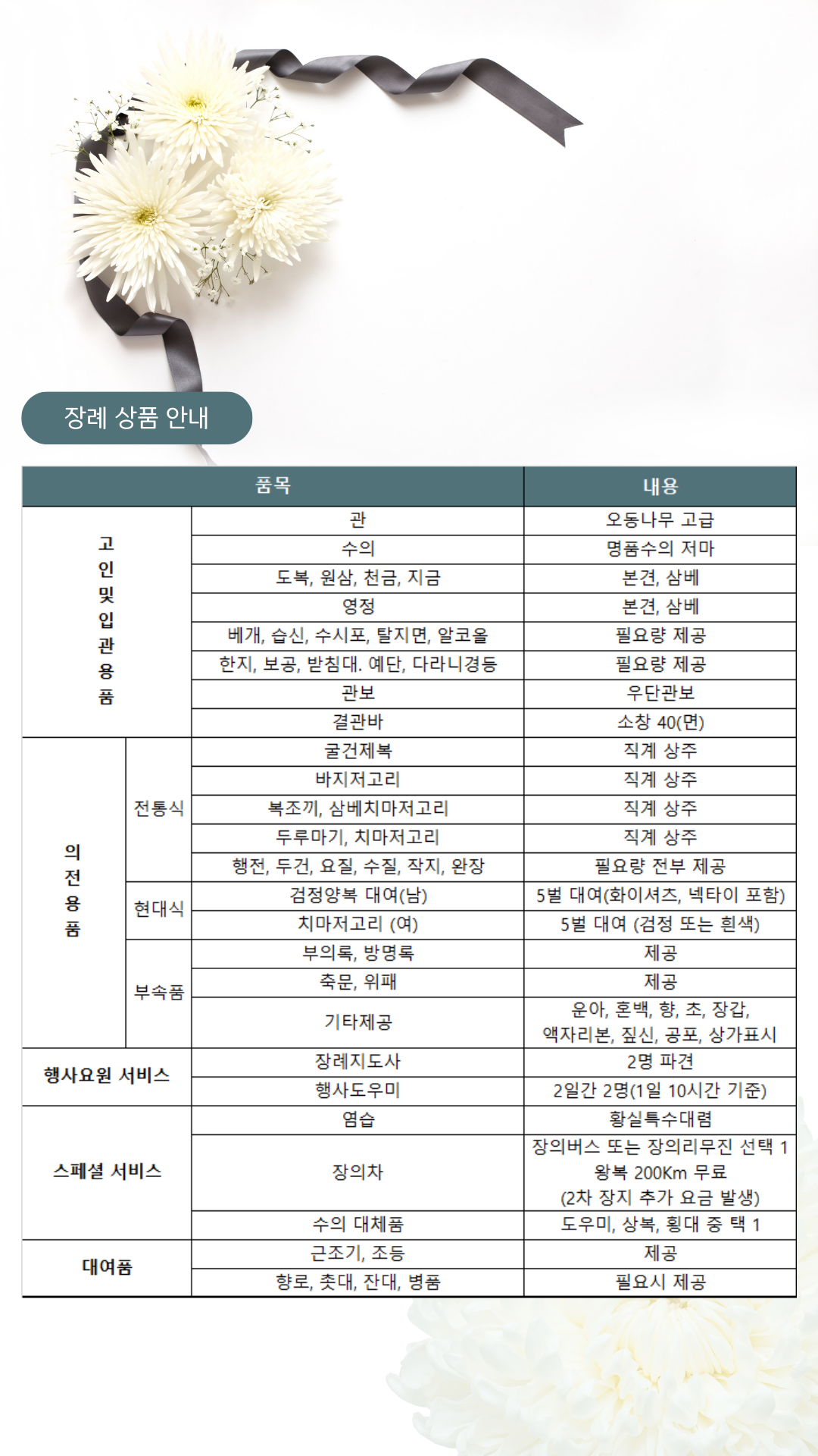 ● 장의 버스 또는 장의 리무진은 왕복 200km 이내 무료 제공 (기본 제공 초과 시 1km당 2,000원 추가)