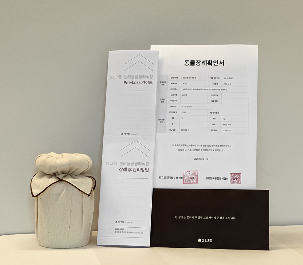 유반려동물 사망(말소) 신고에 필요한 장례 확인서와 장례 후 관리 방법이 담긴 가이드북을 전해드립니다.